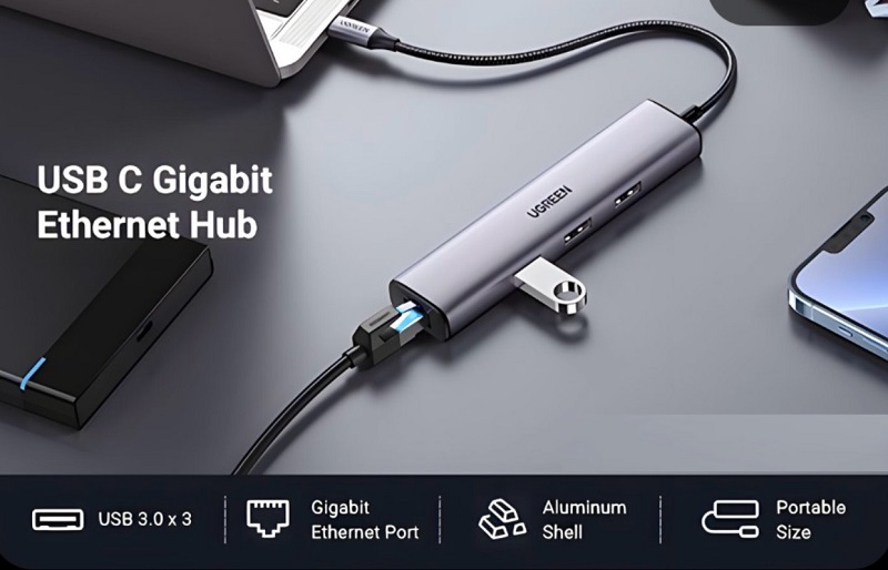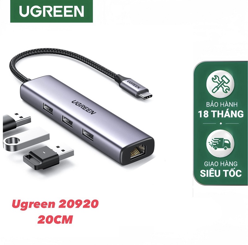 Ugreen 20920 là bộ hub chuyển đổi USB Type-C cao cấp, cho phép mở rộng đồng thời 3 cổng USB 3.0 tốc độ cao và 1 cổng mạng LAN RJ45, đáp ứng nhu cầu kết nối ngoại vi và mạng có dây ổn định cho laptop, ultrabook, MacBook, PC hỗ trợ cổng USB-C.